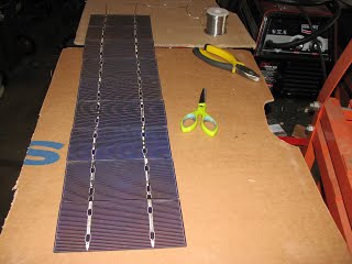 Here is an example of using Bus wire; Say you have 36 cells to build your panel. You have 9 solar cells in a row connected inseries. You would then need to connect all the rows together with bus wire on the tab wire sticking out at the ends of therows. You would have 4 rows of your nine this would be 36. This could make a 20 volt panel. Open volts would give you thevolts to push the power to charge a 12 volt battery. Normal panels made for charging a 12 volt battery normally put out 15volts or higher.