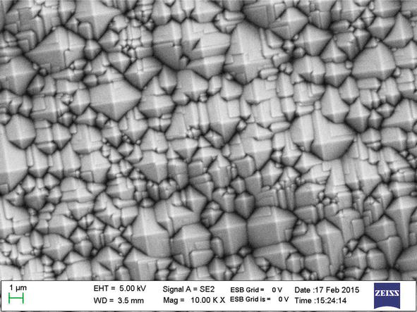 As indicated in Section 2, the development of solar cells started primarily with mono-crystalline wafers and hence employed well-established methods from the domain of microelectronics. Alkaline anisotropic etching based on KOH/NaOH is used for pyramidal texturing of mono-crystalline wafers. An as-cut mono-crystalline wafer has a weighted average reflectance of >30% (over wavelength of 300–1,200 nm) which reduces to 11–12% after the texturing process. Typical morphology of an alkaline textured surface is shown in Figure 5. The anisotropic etching solution etches the (100) surface of the wafers to expose the (111) faces which have a higher density of silicon atoms and hence a slower etch rate compared to the (100) faces. This results in formation of random pyramid structures which form an angle of 54.7° with respect to the wafer surface.