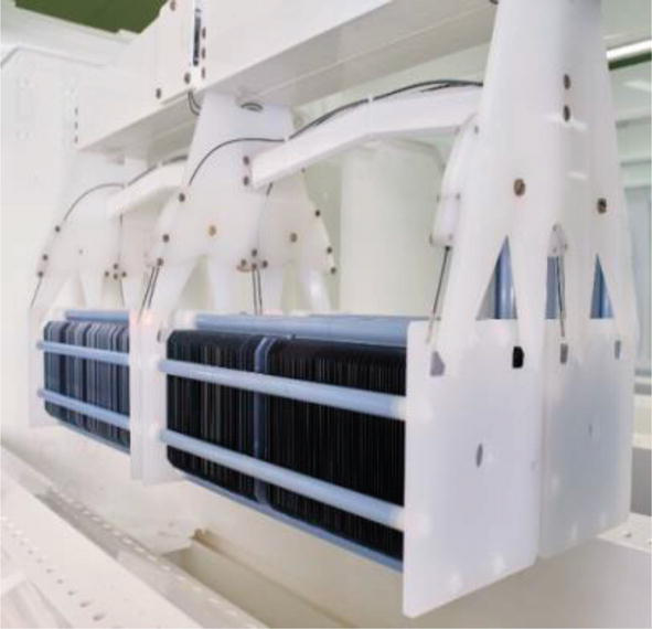 The texturing process of the mono-crystalline wafers is typically performed in a ‘batch’ which implies that the wafers are loaded in a carrier with slots to hold the wafers (100 slots in a carrier) and then the batch is processed sequentially in baths for texturing, cleaning, treatment steps to remove the organic residue and metal contamination and drying the processed wafers. The carriers are typically coated with PVDF which has very good resistance to various chemicals, abrasion and mechanical wear and tear. Typical carrier for mono-crystalline wafers handling is shown in Figure 6. The batch texturing tool has dedicated baths for each step with dosing tanks for chemicals used in the bath. The tool processes many carriers simultaneously and can reach a throughput of >6,000 wafers/h with processing of four carriers at the same time.