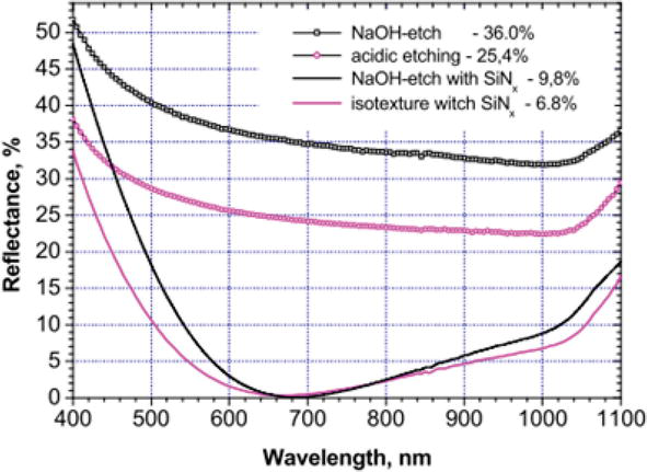Figure 7. Comparison of alkaline and acidic texturing for multi-crystalline wafers. Reflectance curves after deposition of SiNx:H are also showed for comparison [17].