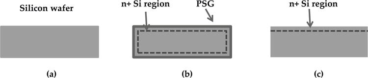 The emitter region in a solar cell is fabricated by a high temperature diffusion process (to be discussed in sections ahead). During the diffusion process, phosphor silicate glass (PSG) is deposited on the wafer which should be removed before deposition of the ARC layer. As depicted in Figure 10, after the diffusion step, the n-type region is also present on the edges and the rear-side of the wafer. The n-type layer on edges and the rear-side will short-circuit the emitter with the base substrate and hence it is important to etch these regions and isolate the emitter on the FS from the base substrate as depicted in Figure 10(c).