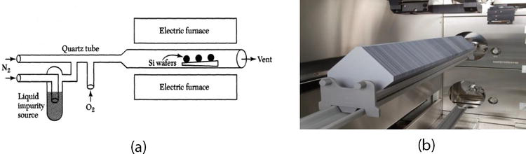 Figure 12. (a) Schematic representation of the batch-type diffusion process and (b) representative image of a batch-type diffusion equipment. Source: centrotherm GmbH.