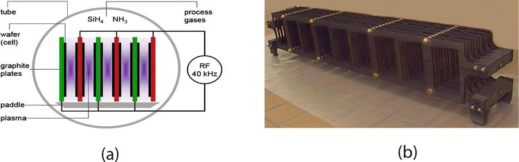 Figure 14. (a) Schematic diagram of batch-type PECVD process for SiNx:H deposition and (b) graphite boat for loading Si wafers in the PECVD furnace.