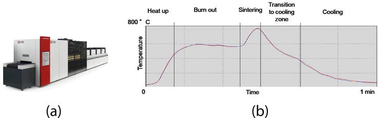 Figure 18. (a) Example of a firing furnace for sintering metal contacts and (b) illustrative temperature profile of a firing furnace. Source: centrotherm GmbH.