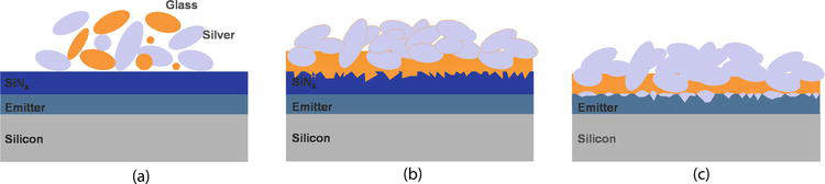 Figure 19. Illustration of the firing process. (a) Burning out of the organic binders, (b) melting of glass frit which etches the SiNx:H and (c) Ag crystallite formation at the emitter interface.